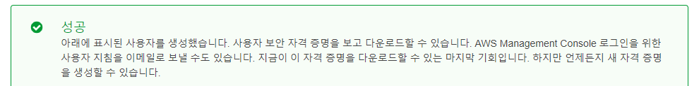 이때 제공하는 엑세스 키 ID와 비밀 엑세스 키를 .csv로 저장해둘 수 있다.