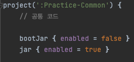 * 이때 Practice-Common만 bootJar가 false로 설정되어 있다.
