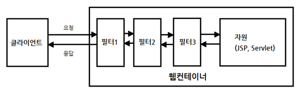 필터가 하는 역할은 클라이언트와 자원 사이에서 요청과 응답 정보를 이용해 다양한 처리를 하는데 목적이 있다.