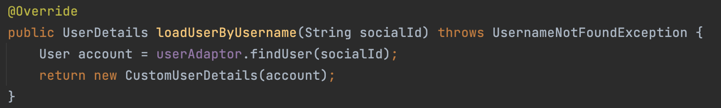 public UserDetails loadUserByUsername(String socialId) throws UsernameNotFoundException {